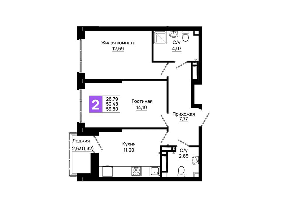 Жилая площадь 26.79 м2, кухня 11.2 м2, предчистовая отделка.
