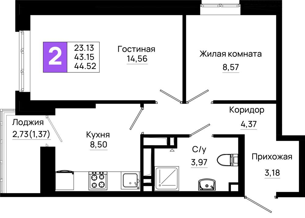 Жилая площадь 23.13 м2, кухня 8.5 м2, предчистовая отделка.