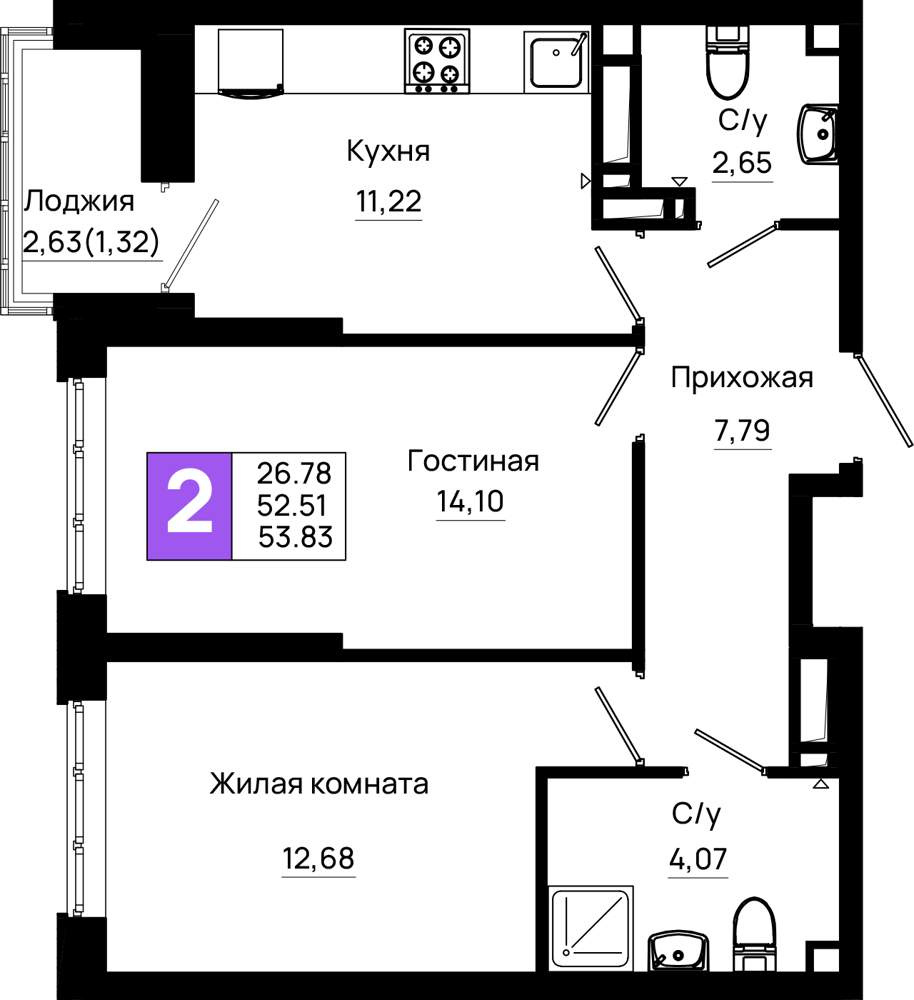 Жилая площадь 26.78 м2, кухня 11.22 м2, предчистовая отделка.