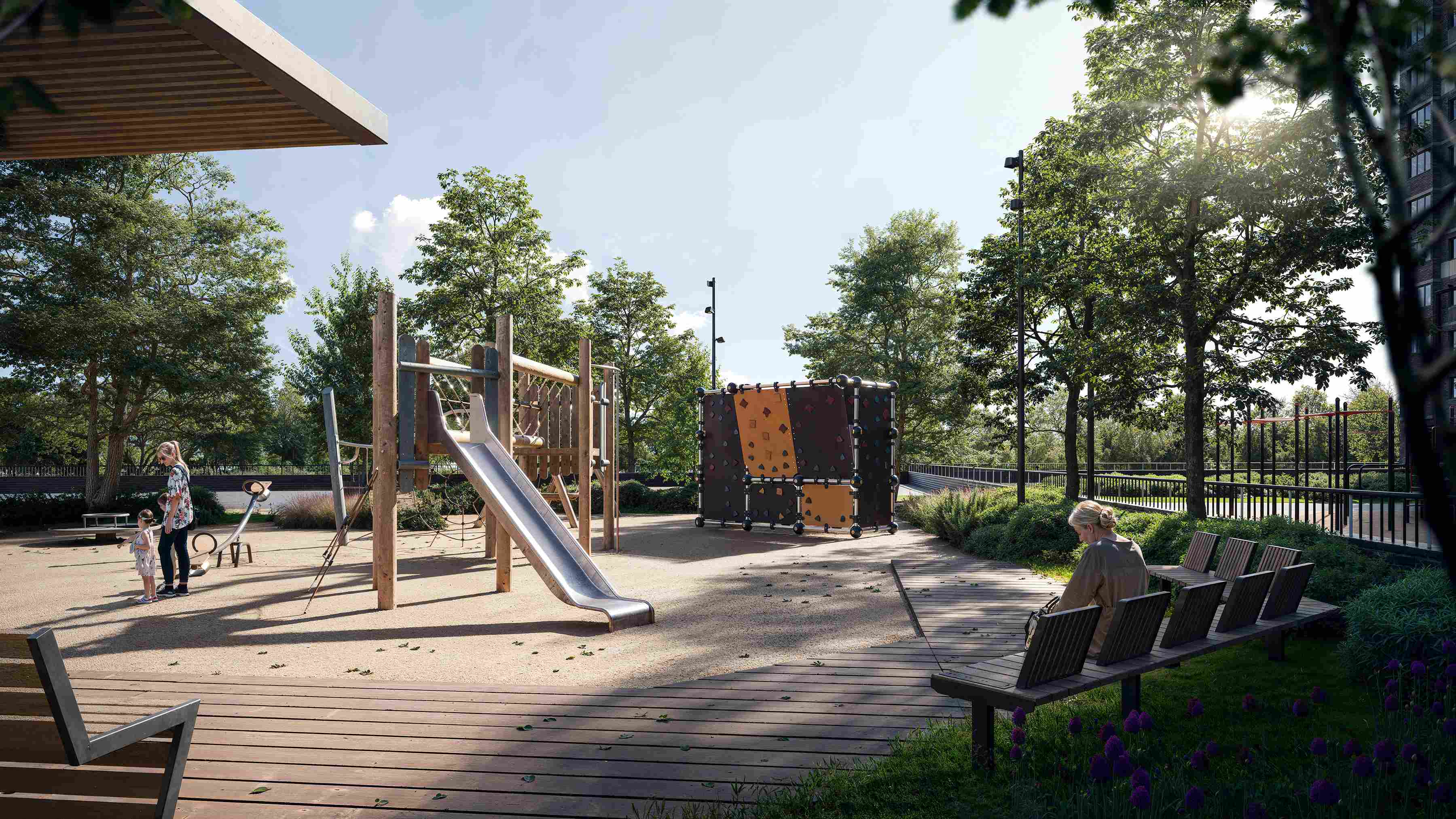 Дизайн, продуманный до мелочей: оформление холлов продолжает концепцию двора и лаконично сочетается с обрамлением здания. Здесь экологичные материалы и приятные спокойные тона, разные уровни освещения, почтовые ящики, просторные колясочные и удобные лапомойки.