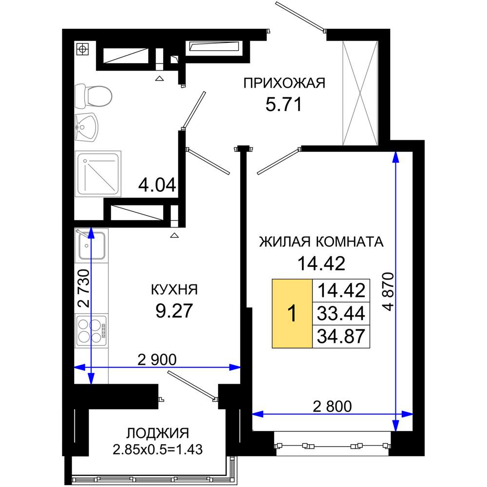 Продам однокомнатную квартиру в новостройке 34.9 м.кв.