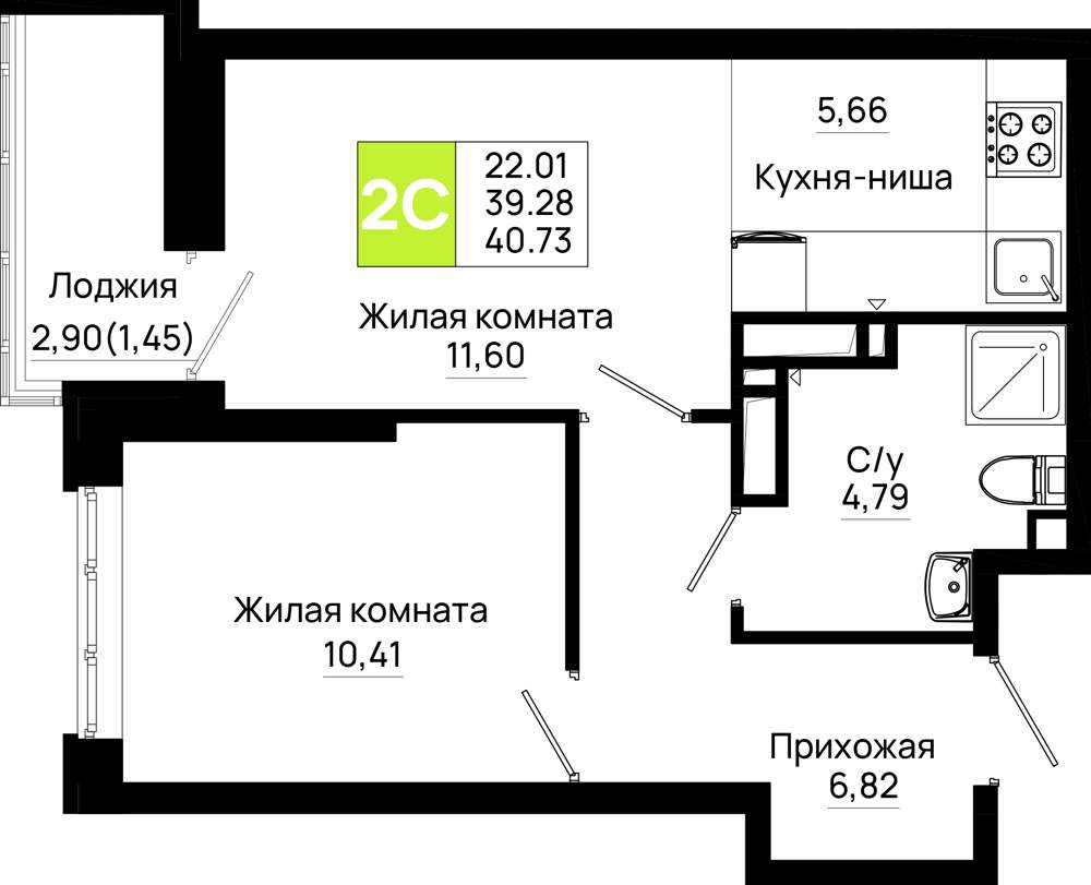 Жилая площадь 26.4 м2, кухня 5.11 м2, предчистовая отделка, комнаты изолированные.