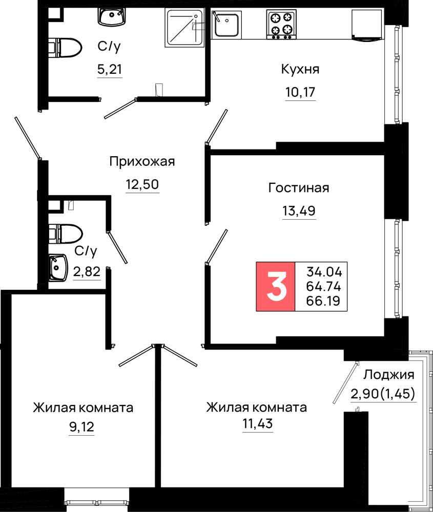 Продажа трехкомнатной квартиры в новостройке в Ростове-на-Дону 51-100 кв.м.